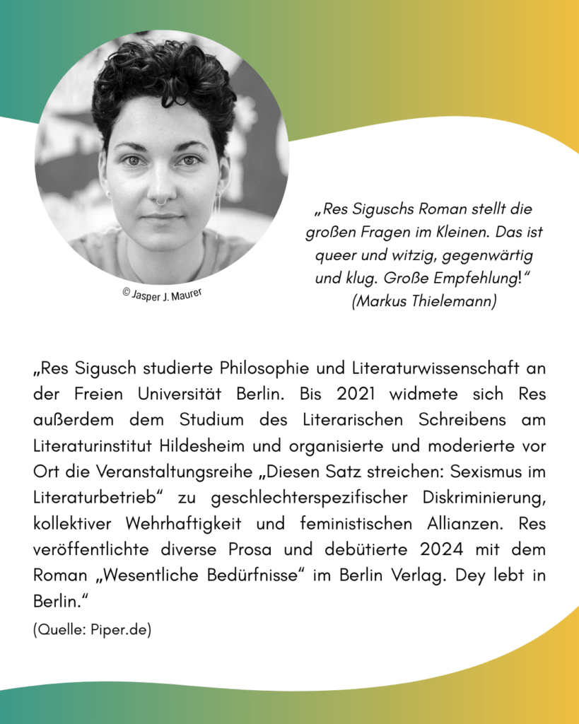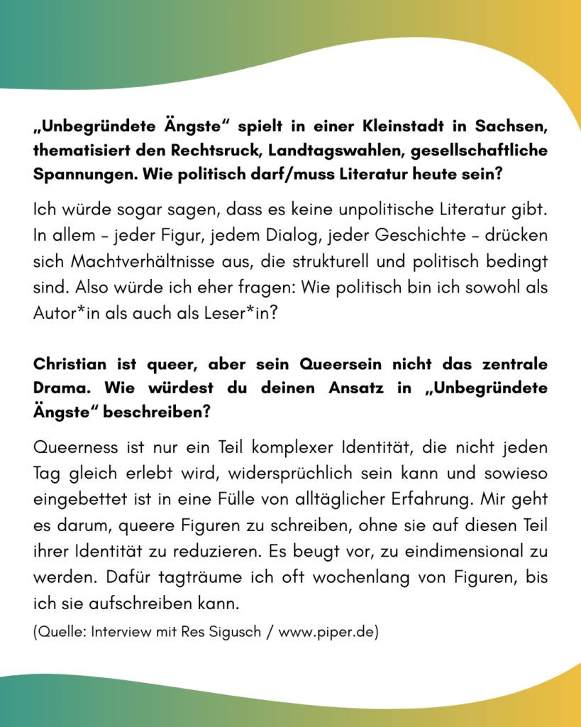Zum Buch: „Christian Lotz (30) lebt als queerer Single in einer sächsischen Kleinstadt. Jeden Sonntag trifft er sich mit seinen Eltern zum Sektfrühstück, unter der Woche arbeitet er im Fitnessstudio. Muskulös und gutaussehend – seine Mutter schwärmt, er sehe aus wie David Beckham Anfang der 2000er –, ist er innerlich von Unsicherheit geplagt und sorgt sich im Grunde um alles: Wie wirkt er auf andere? Warum findet er nicht den richtigen Mann? Was bringt die Zukunft in Zeiten von Klimawandel, Rechtsextremismus und Pandemien? Und ist er nicht vielleicht längst unheilbar krank, wie ihm seine täglichen Internetrecherchen weismachen wollen? Seine Antwort ist stets die größtmögliche Katastrophe. So wächst in Christian eine existenzielle Angst, die bald keinen Anlass mehr kennt. Erst als seine Lage unübersehbar wird, öffnet er sich seinem Umfeld – und erfährt: Geteilte Angst ist halbe Angst. Und manchmal braucht es bloß einen Funken Mut.“